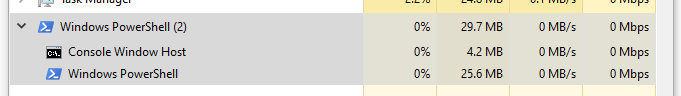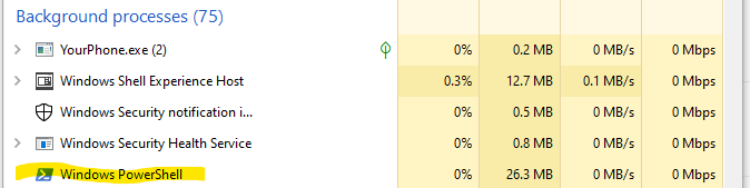 Close all command windows, open the Task Manager with CTRL+ALT+DEL, then open a single new PowerShell window. You should see the instance appear in the “Apps” list.