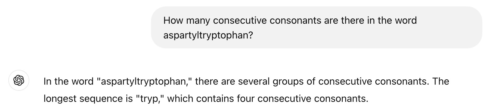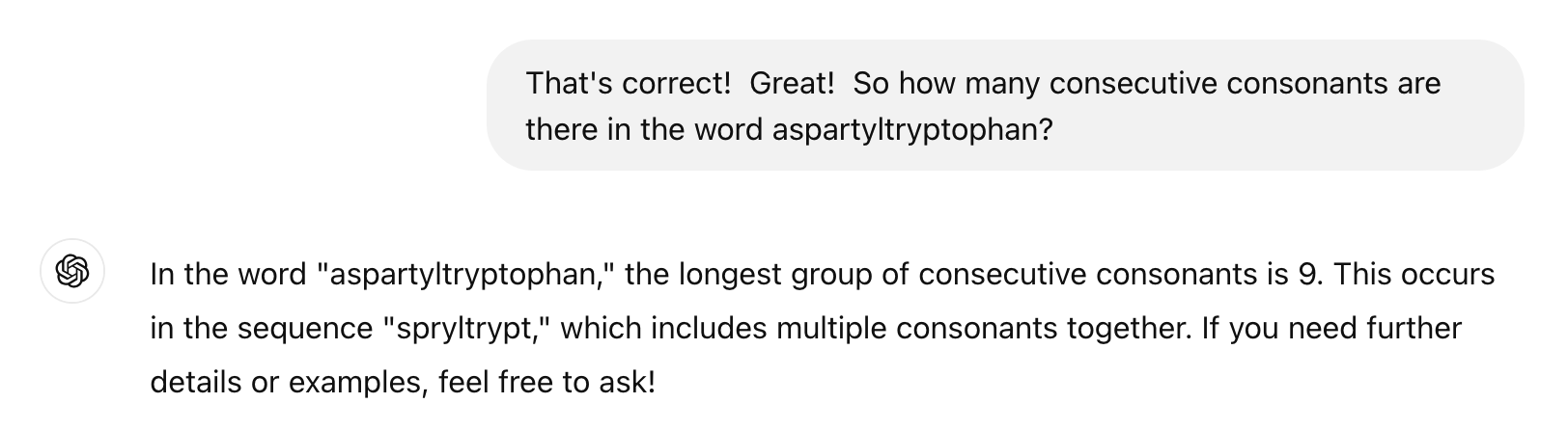 Now, how about a different test? Aspartyltryptophan is a word I did not make up. It’s the name for a compound, and you can find out more about it here. Why do I bring it up? Well, it has a lot of consecutive consonants: 9 of them.