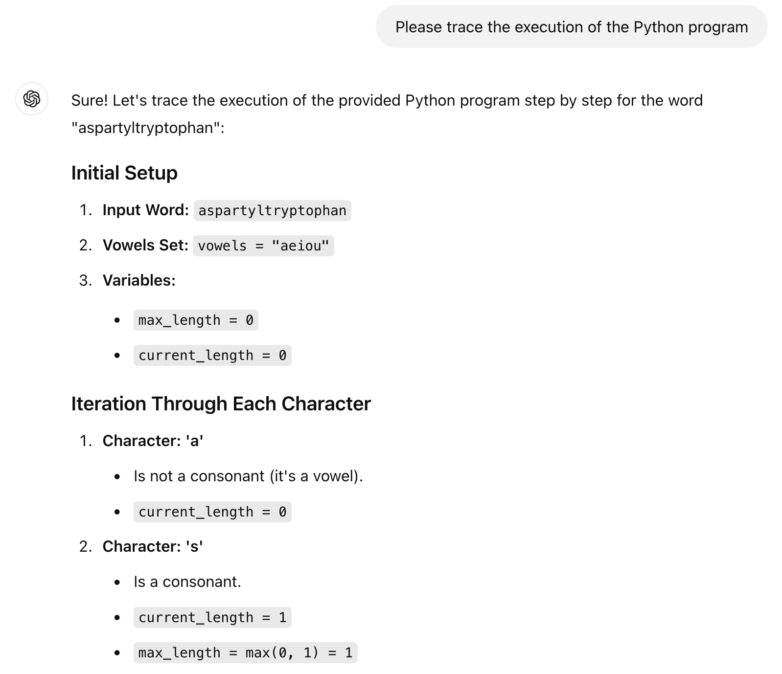 This resulted in getting the correct output! The number of consonants is, in fact, 9! Getting the correct result from tracing is quite interesting. Let’s see if ChatGPT has learned anything.